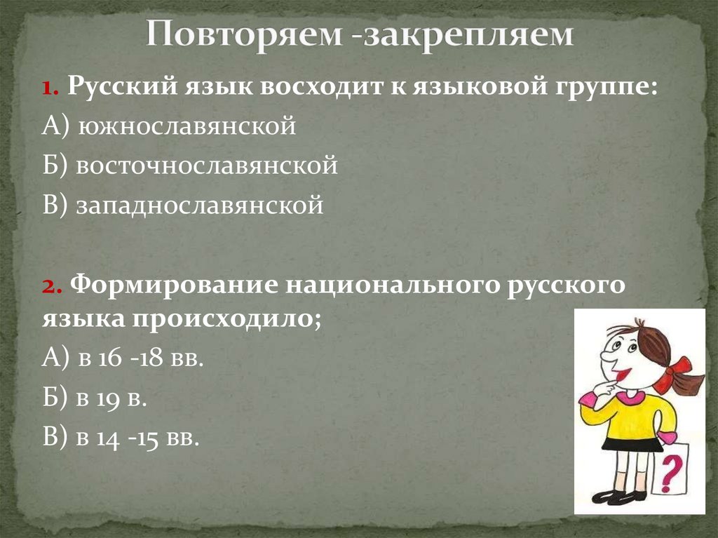 1. Русский язык восходит к языковой группе:А) южнославянской