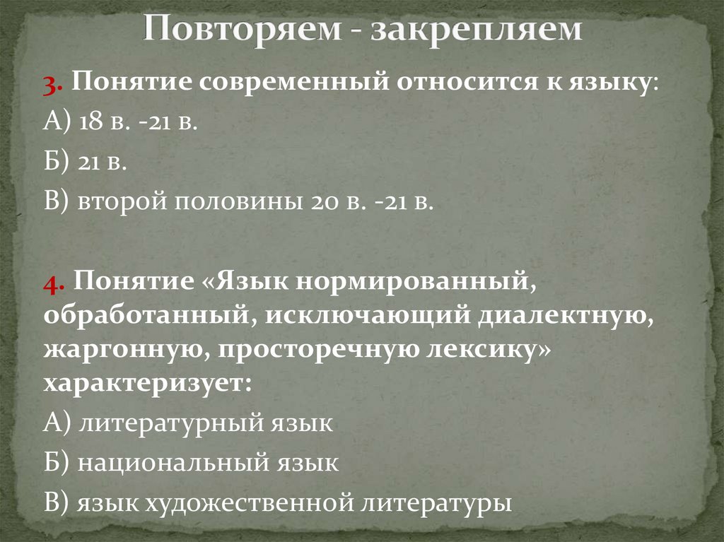 3. Понятие современный относится к языку:А) 18 в. -21 в.