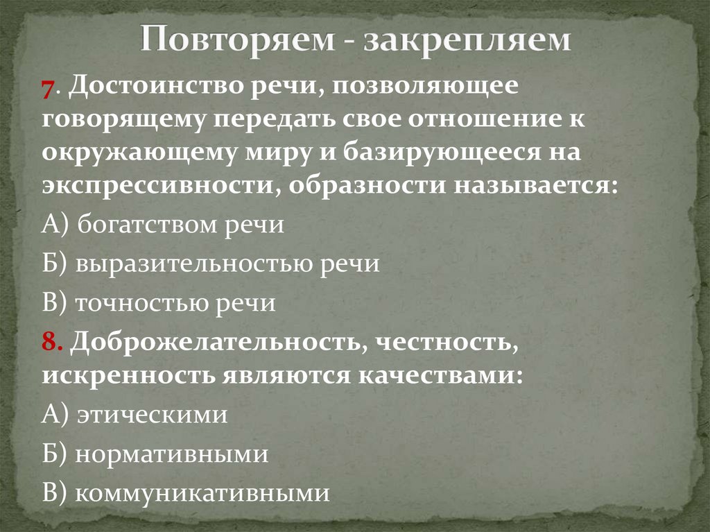 7. Достоинство речи, позволяющееговорящему передать свое отношение к