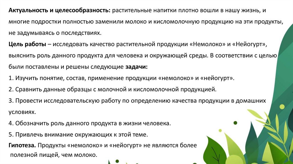Актуальность и целесообразность: растительные напитки плотно вошли в нашу жизнь, имногие подростки полностью заменили молоко и кисломолочную продукцию на эти продукты,