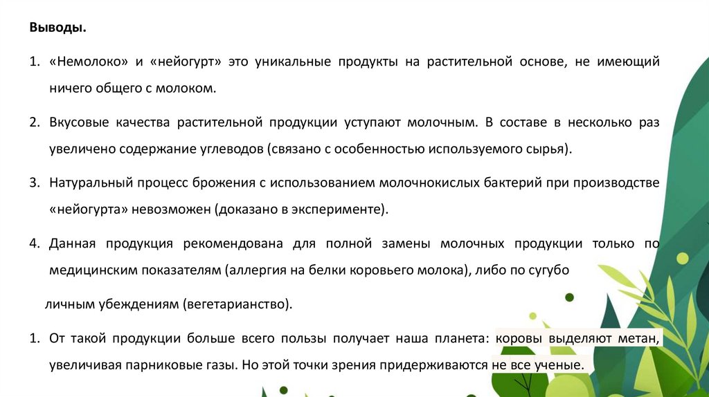 Выводы.1. «Немолоко» и «нейогурт» это уникальные продукты на растительной основе, не имеющий