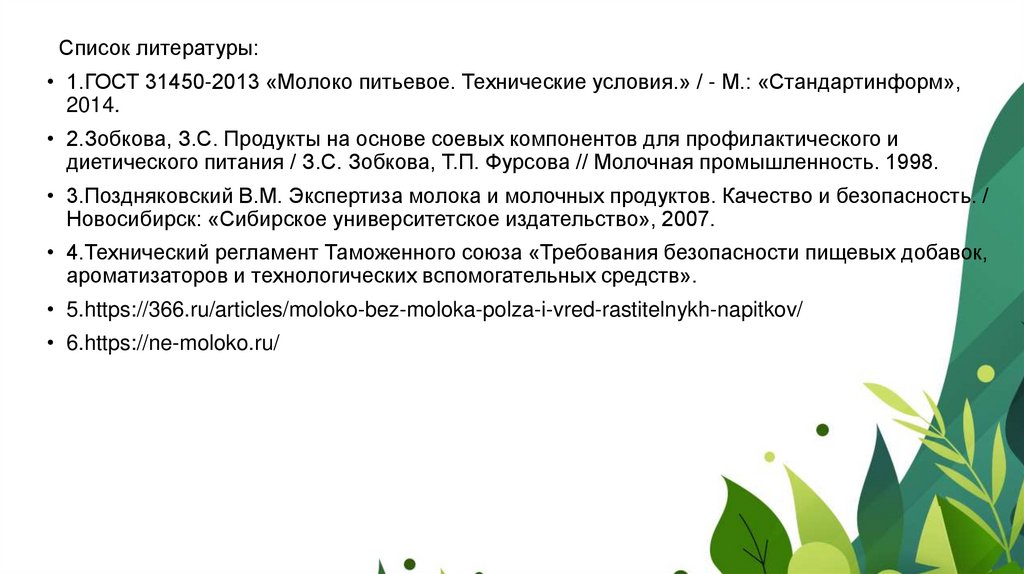 Список литературы:• 1.ГОСТ 31450-2013 «Молоко питьевое. Технические условия.» / - М.: «Стандартинформ»,