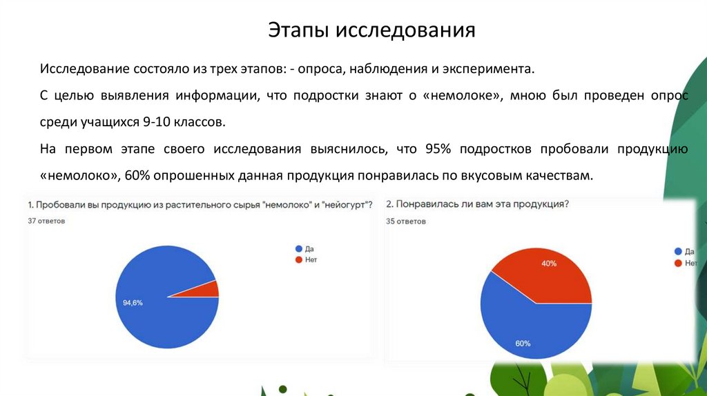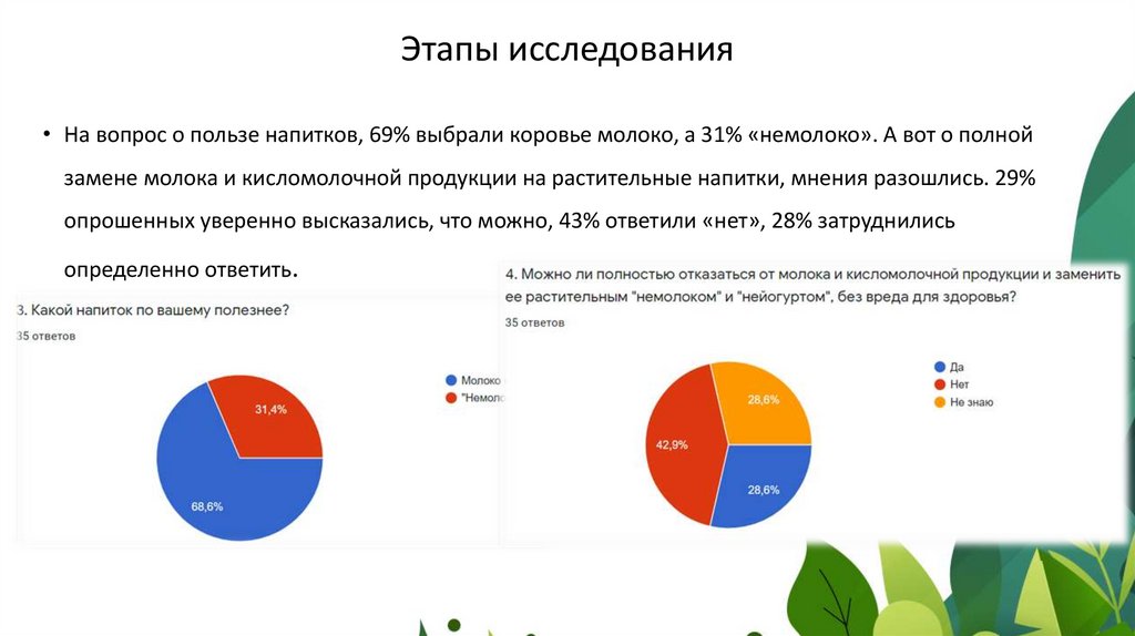 Этапы исследования• На вопрос о пользе напитков, 69% выбрали коровье молоко, а 31% «немолоко». А вот о полной