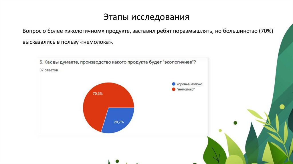 Этапы исследованияВопрос о более «экологичном» продукте, заставил ребят поразмышлять, но большинство (70%)