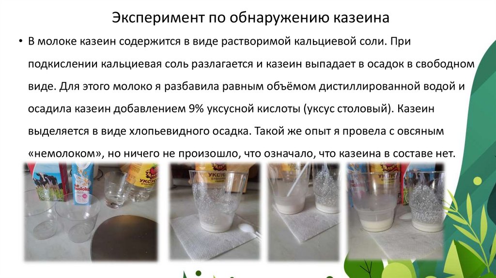 Эксперимент по обнаружению казеина• В молоке казеин содержится в виде растворимой кальциевой соли. При