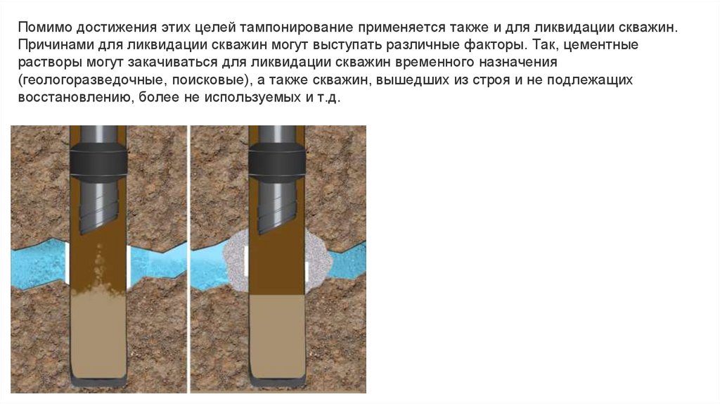 Помимо достижения этих целей тампонирование применяется также и для ликвидации скважин.Причинами для ликвидации скважин могут выступать различные факторы. Так, цементные