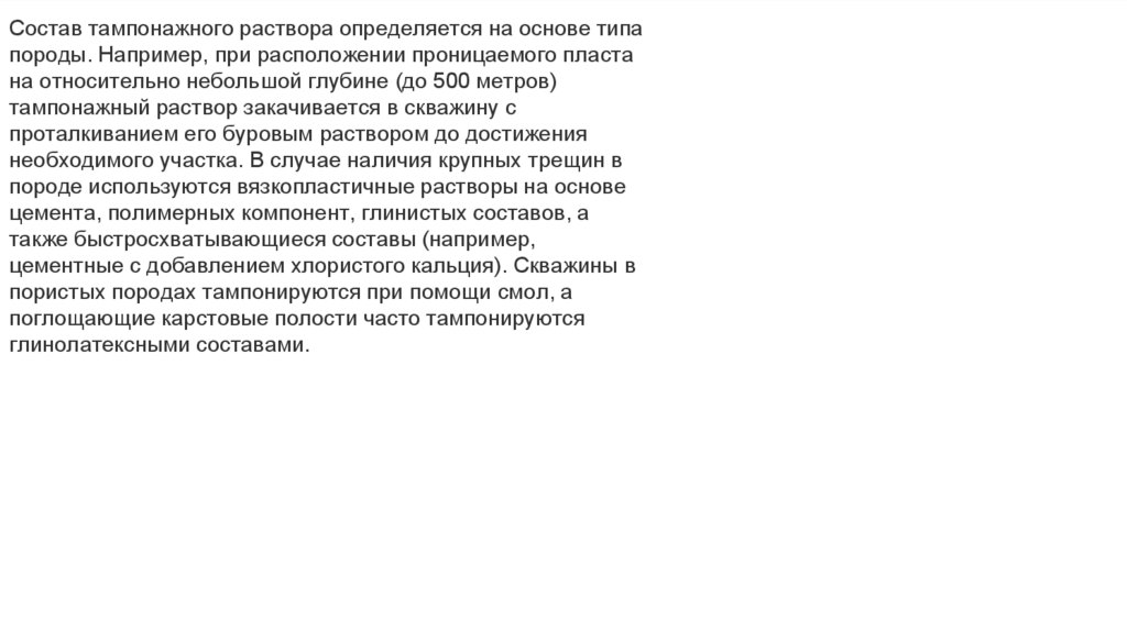 Состав тампонажного раствора определяется на основе типапороды. Например, при расположении проницаемого пласта