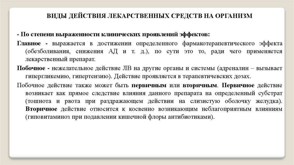 ВИДЫ ДЕЙСТВИЯ ЛЕКАРСТВЕННЫХ СРЕДСТВ НА ОРГАНИЗМ- По степени выраженности клинических проявлений эффектов: