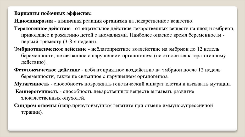 Тератогенное действие - отрицательное действие лекарственных веществ на плод и эмбрион,