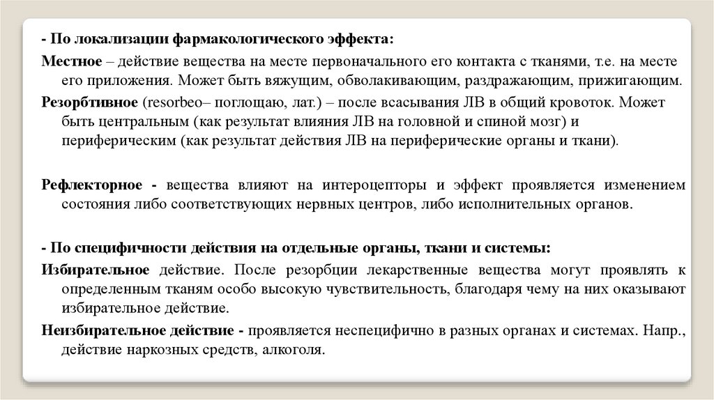 - По локализации фармакологического эффекта:Местное – действие вещества на месте первоначального его контакта с тканями, т.е. на месте