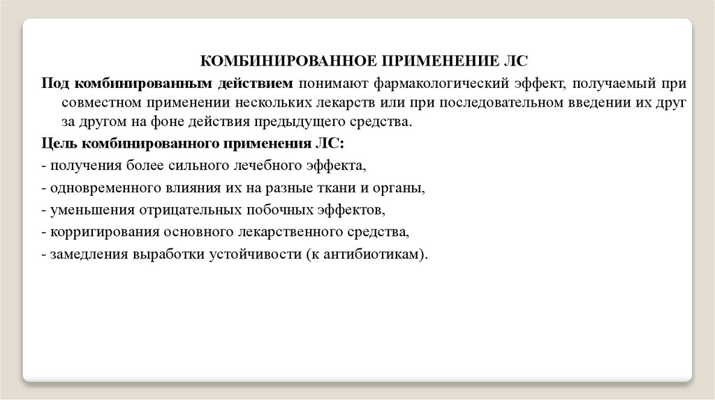 КОМБИНИРОВАННОЕ ПРИМЕНЕНИЕ ЛСПод комбинированным действием понимают фармакологический эффект, получаемый при