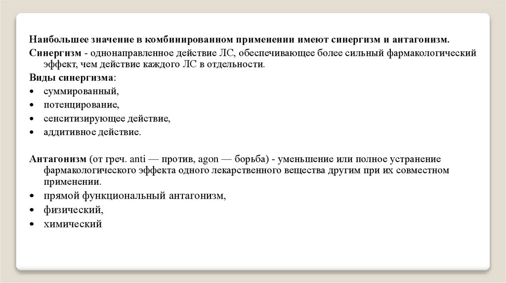 Наибольшее значение в комбинированном применении имеют синергизм и антагонизм.Синергизм - однонаправленное действие ЛС, обеспечивающее более сильный фармакологический