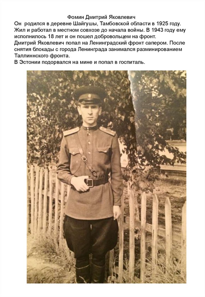 Фомин Дмитрий ЯковлевичОн родился в деревне Шайгушы, Тамбовской области в 1925 году.