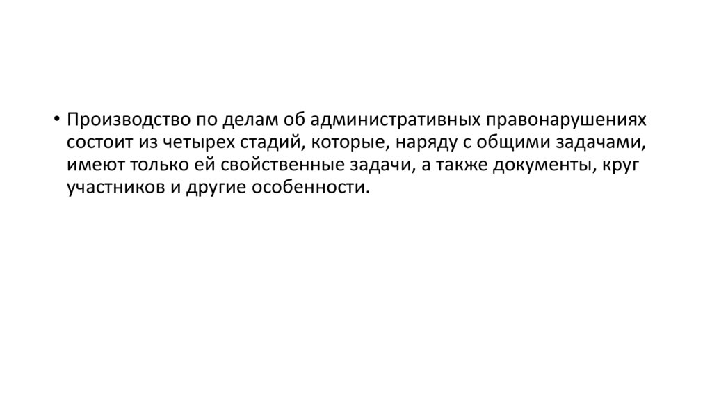 • Производство по делам об административных правонарушенияхсостоит из четырех стадий, которые, наряду с общими задачами,