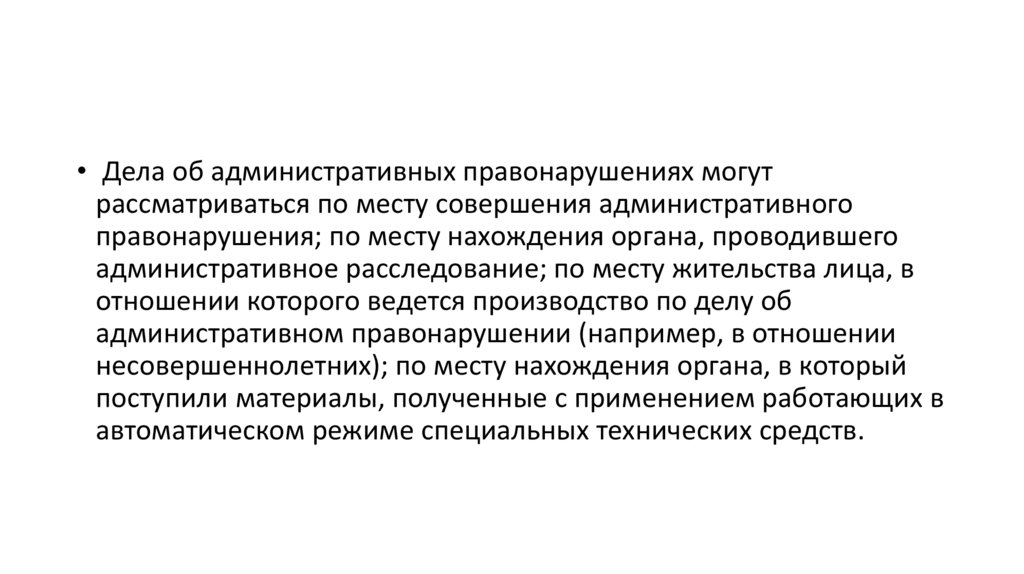 • Дела об административных правонарушениях могутрассматриваться по месту совершения административного