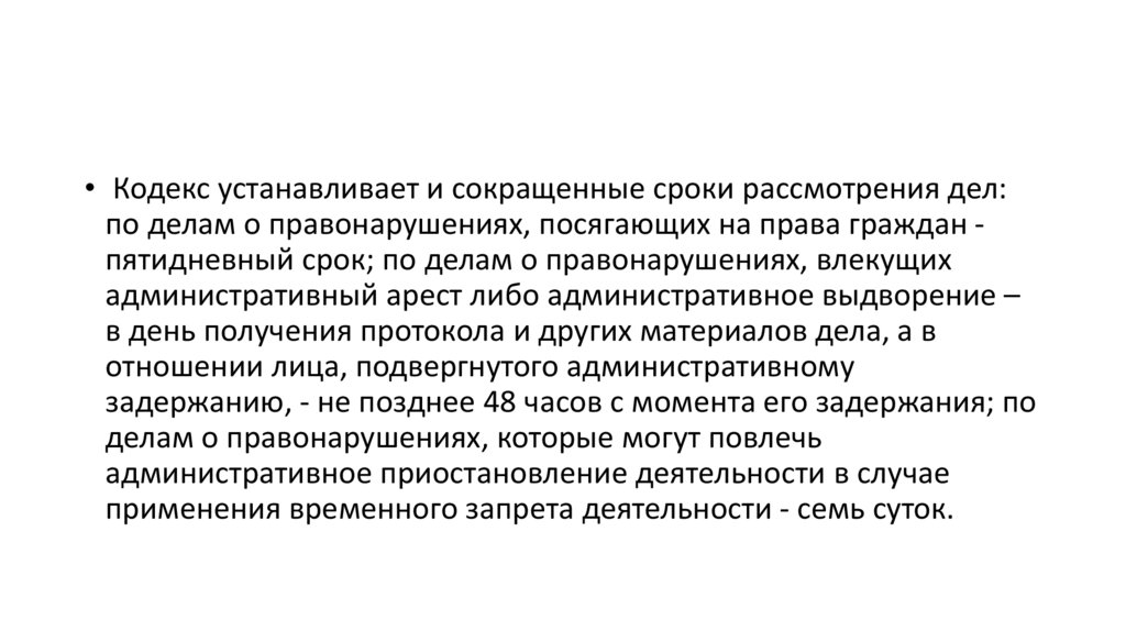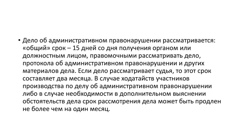 • Дело об административном правонарушении рассматривается:«общий» срок – 15 дней со дня получения органом или