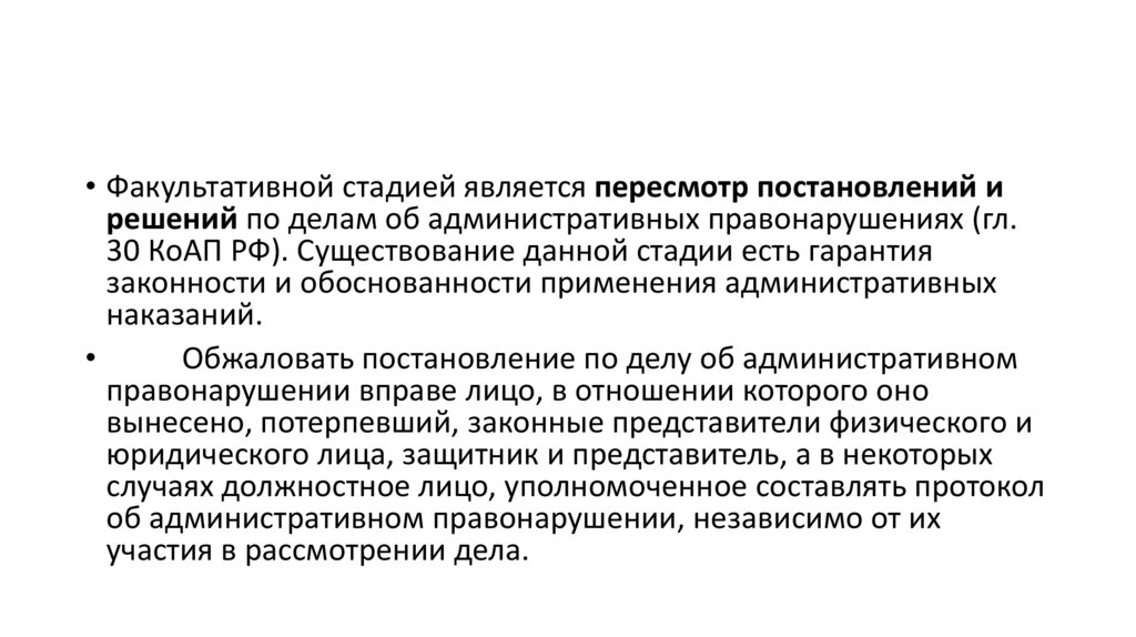 • Факультативной стадией является пересмотр постановлений ирешений по делам об административных правонарушениях (гл.