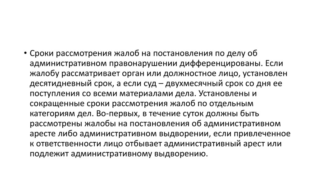 • Сроки рассмотрения жалоб на постановления по делу обадминистративном правонарушении дифференцированы. Если