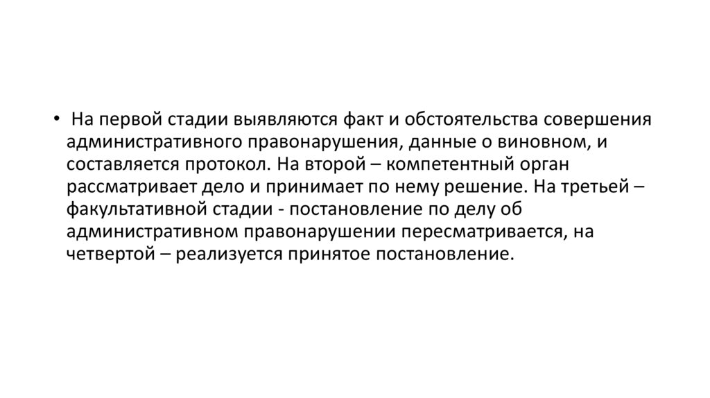 • На первой стадии выявляются факт и обстоятельства совершенияадминистративного правонарушения, данные о виновном, и