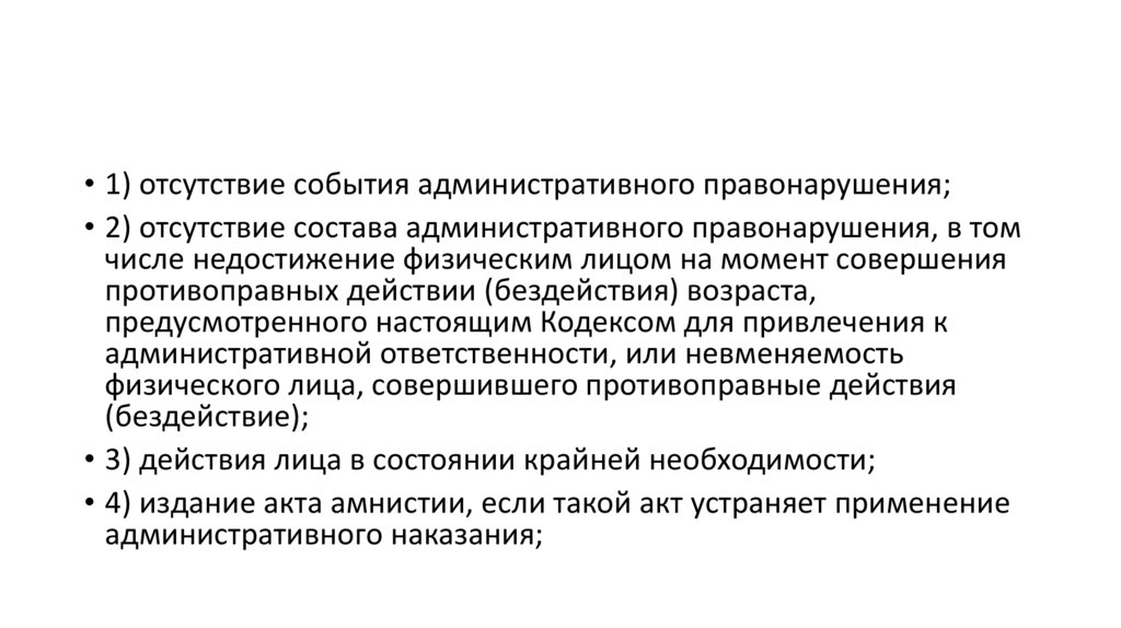 • 1) отсутствие события административного правонарушения;• 2) отсутствие состава административного правонарушения, в том