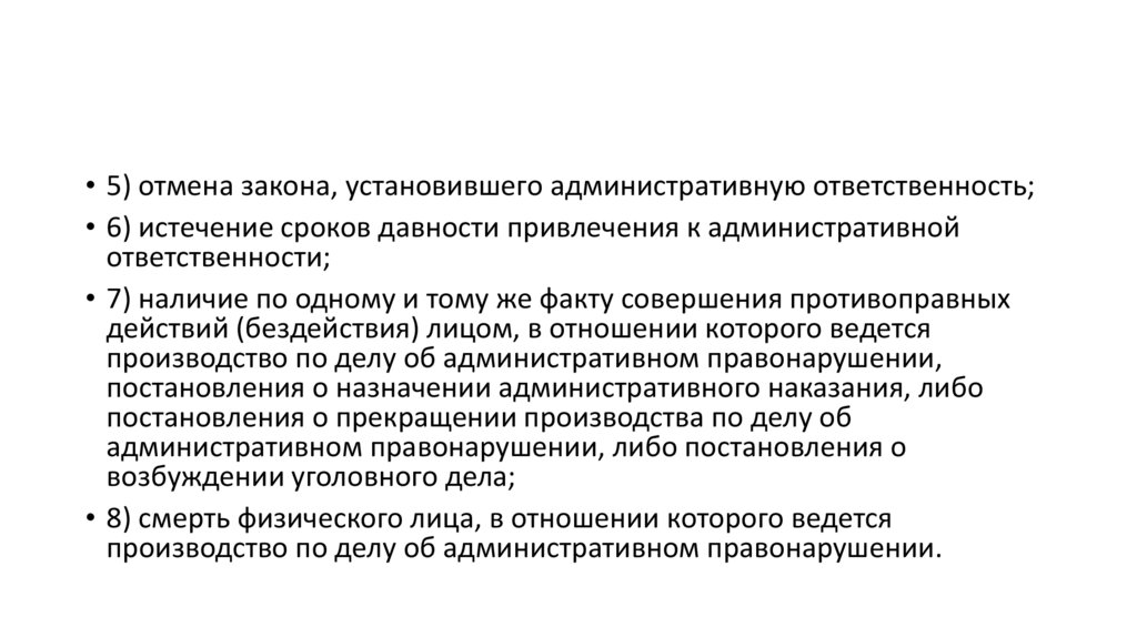 • 5) отмена закона, установившего административную ответственность;• 6) истечение сроков давности привлечения к административной