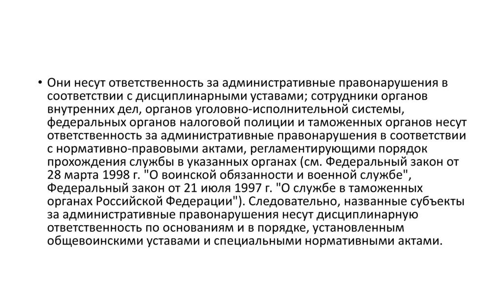 • Они несут ответственность за административные правонарушения всоответствии с дисциплинарными уставами; сотрудники органов