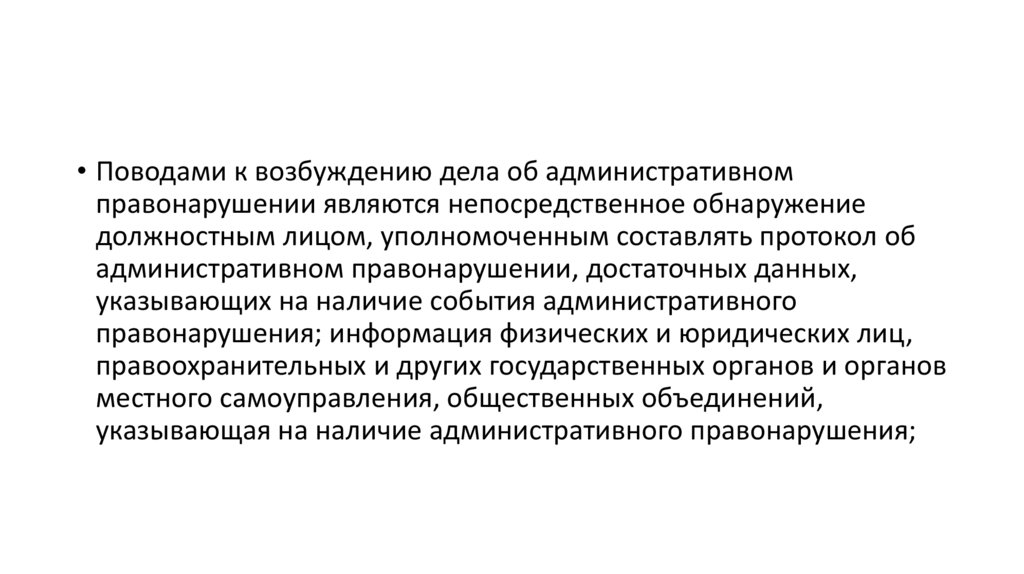 • Поводами к возбуждению дела об административномправонарушении являются непосредственное обнаружение