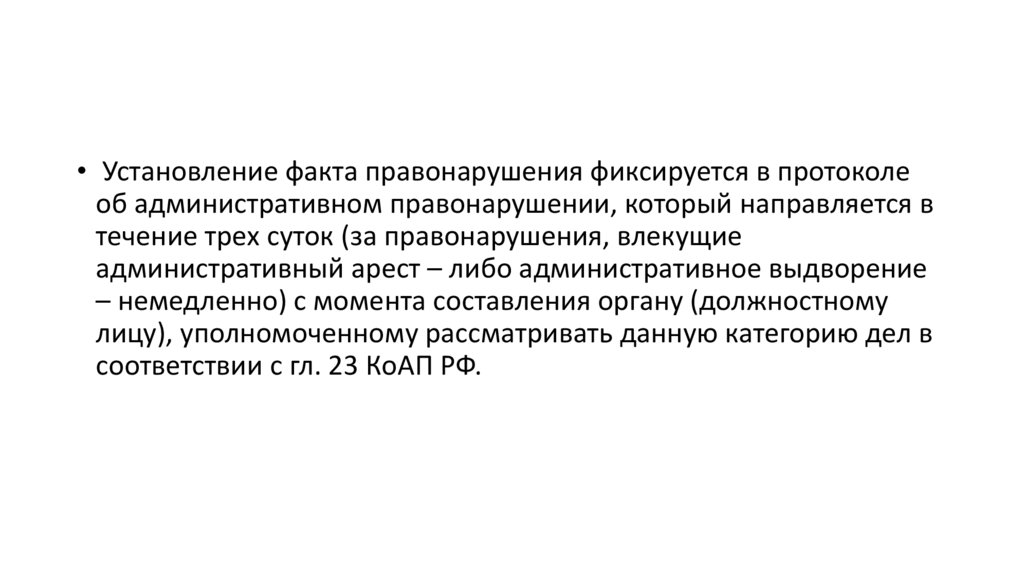 • Установление факта правонарушения фиксируется в протоколеоб административном правонарушении, который направляется в