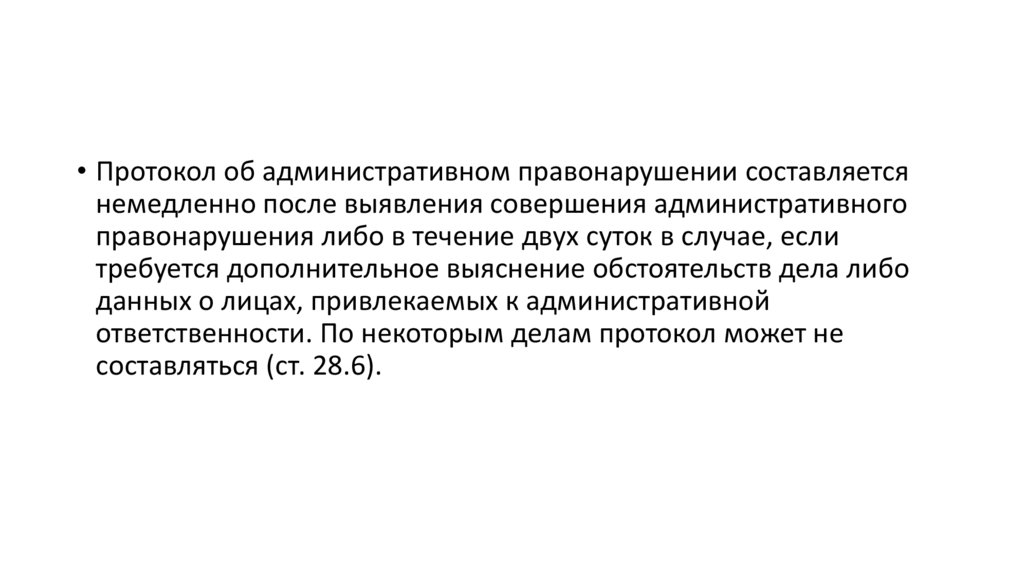 • Протокол об административном правонарушении составляетсянемедленно после выявления совершения административного