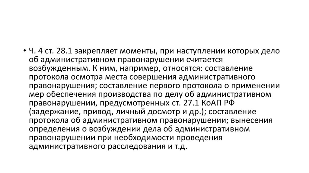 • Ч. 4 ст. 28.1 закрепляет моменты, при наступлении которых делооб административном правонарушении считается
