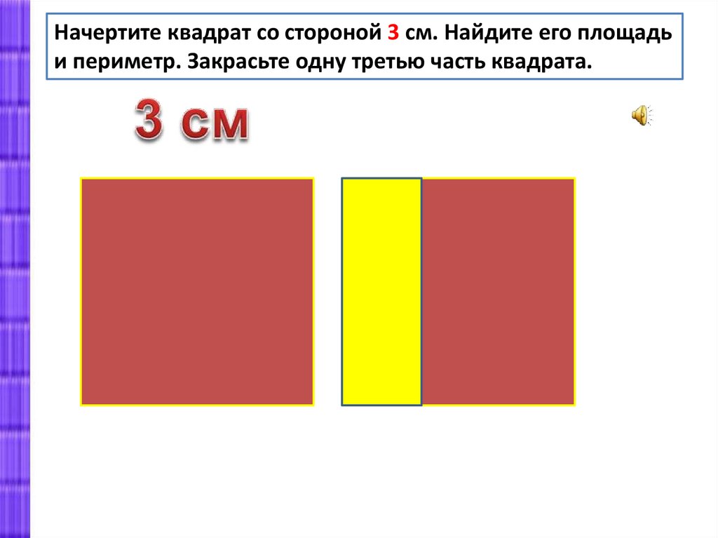 Начертите квадрат со стороной 3 см. Найдите его площадьи периметр. Закрасьте одну третью часть квадрата.