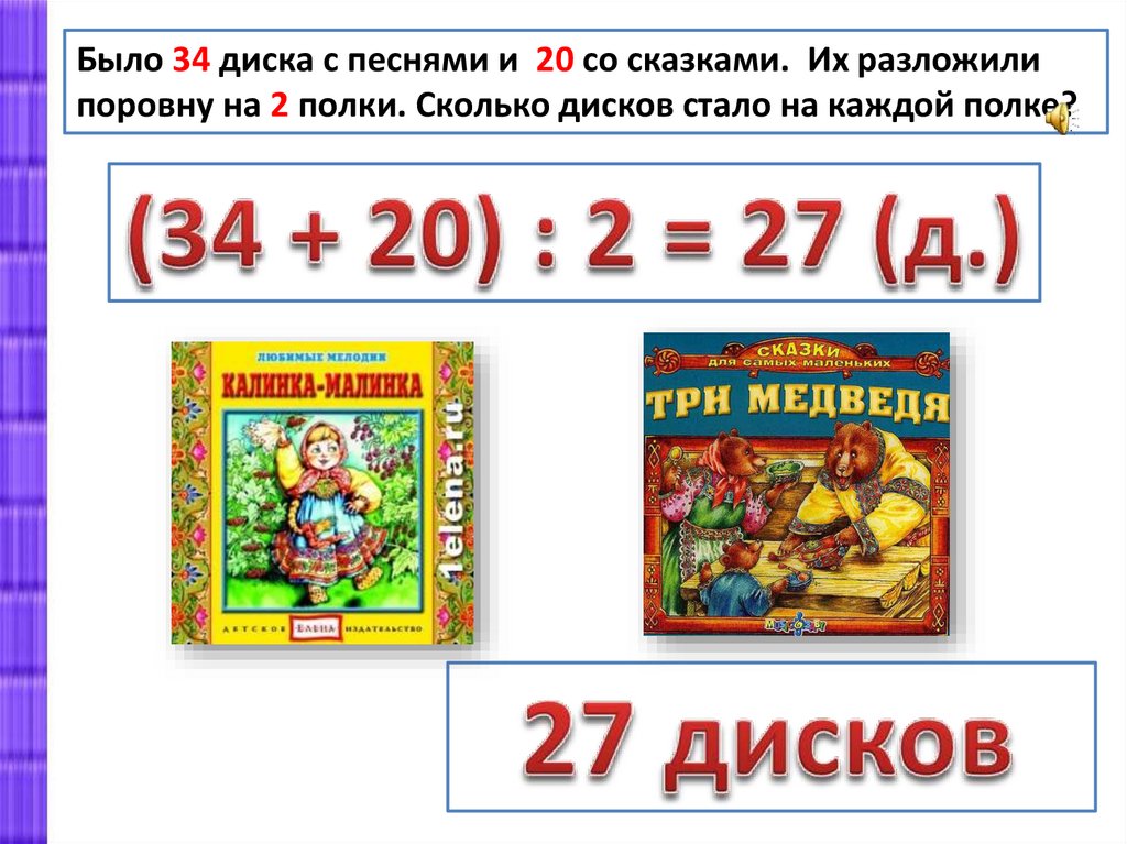 Было 34 диска с песнями и 20 со сказками. Их разложилипоровну на 2 полки. Сколько дисков стало на каждой полке?