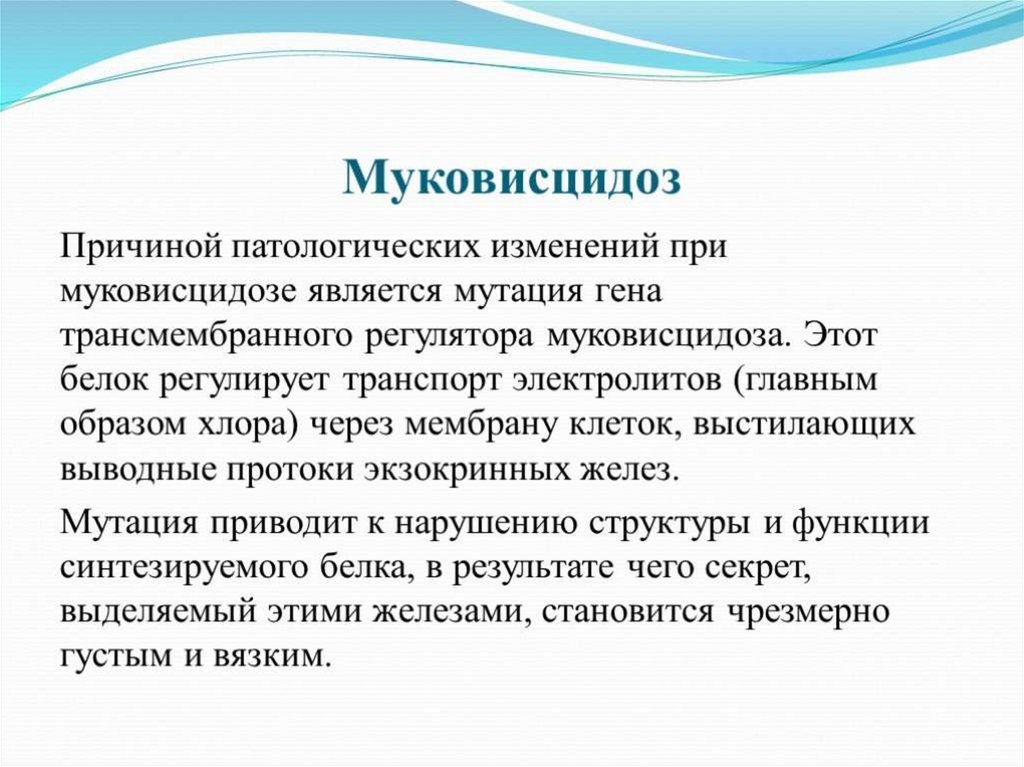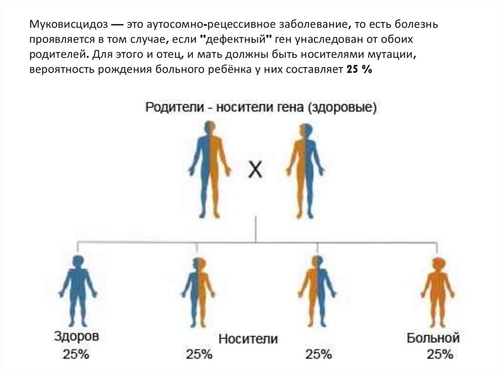 Муковисцидоз — это аутосомно-рецессивное заболевание, то есть болезньпроявляется в том случае, если "дефектный" ген унаследован от обоих