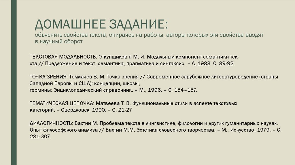 ДОМАШНЕЕ ЗАДАНИЕ:объяснить свойства текста, опираясь на работы, авторы которых эти свойства вводят