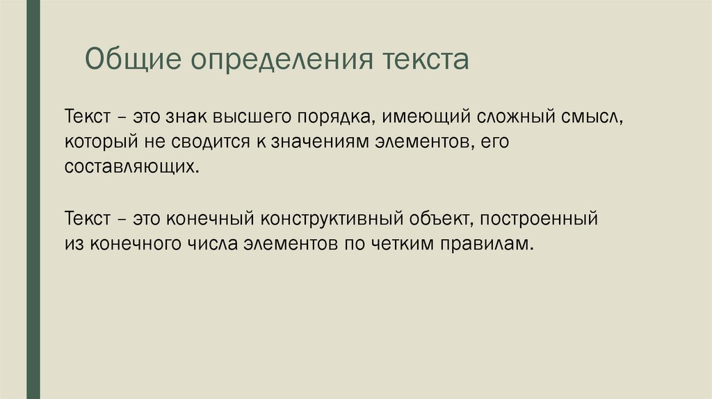Общие определения текстаТекст – это знак высшего порядка, имеющий сложный смысл,