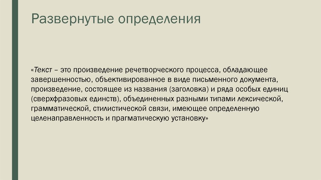 Развернутые определения«Текст – это произведение речетворческого процесса, обладающее