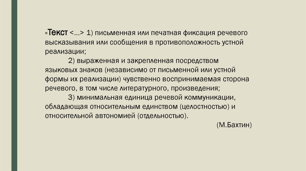 «Текст <...> 1) письменная или печатная фиксация речевоговысказывания или сообщения в противоположность устной