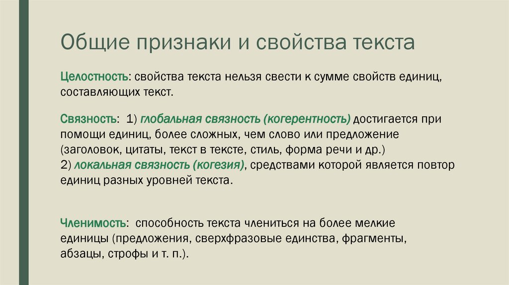 Общие признаки и свойства текстаЦелостность: свойства текста нельзя свести к сумме свойств единиц,