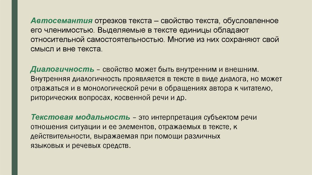Автосемантия отрезков текста – свойство текста, обусловленноеего членимостью. Выделяемые в тексте единицы обладают