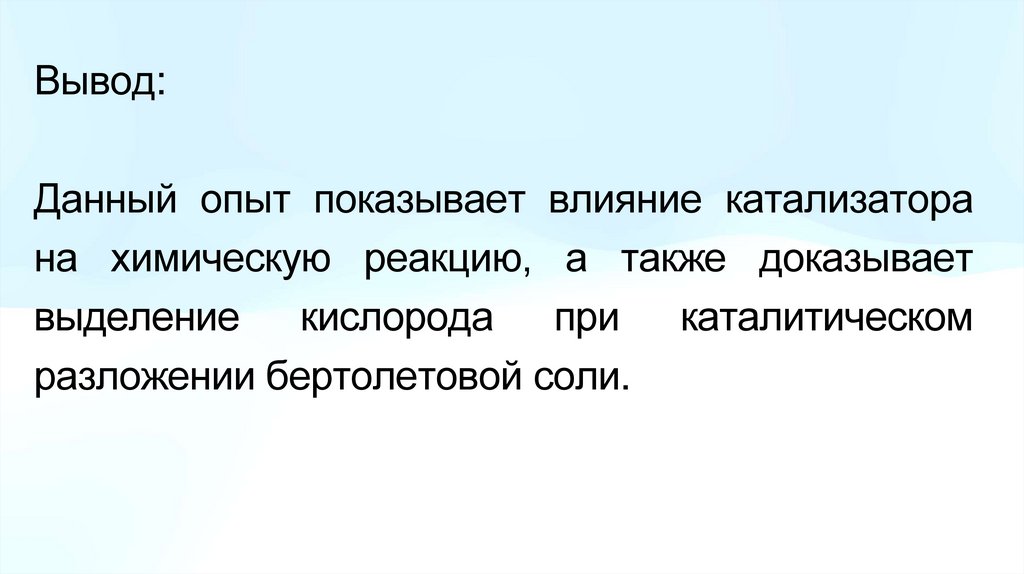 Вывод:Данный опыт показывает влияние катализатора