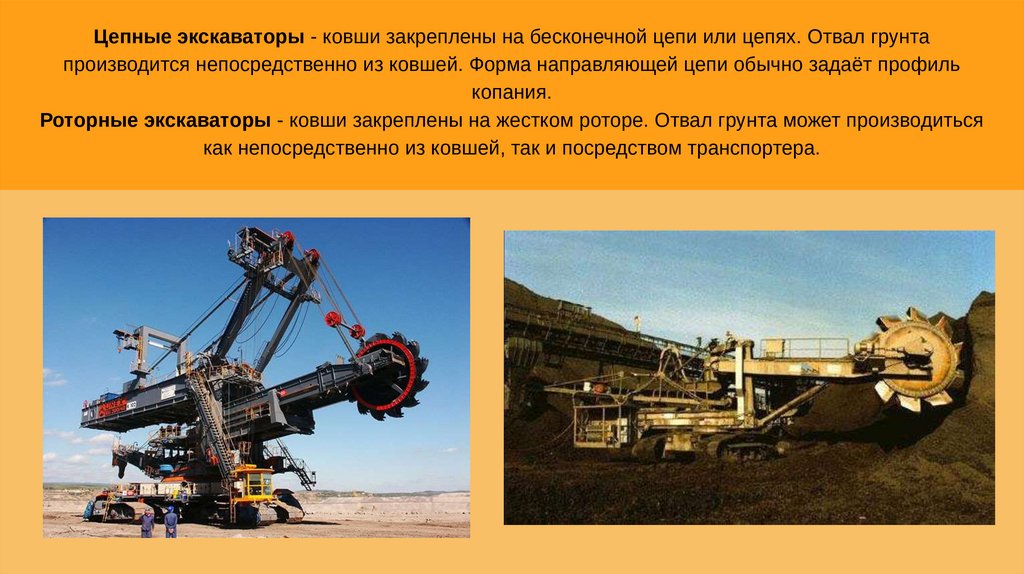 Цепные экскаваторы - ковши закреплены на бесконечной цепи или цепях. Отвал грунтапроизводится непосредственно из ковшей. Форма направляющей цепи обычно задаёт профиль
