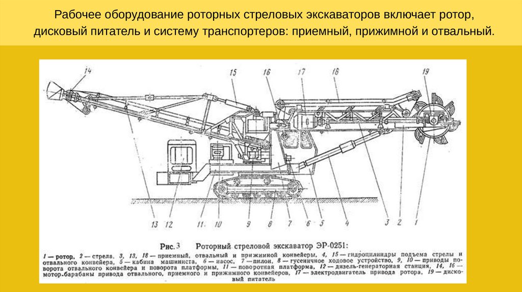 Рабочее оборудование роторных стреловых экскаваторов включает ротор,дисковый питатель и систему транспортеров: приемный, прижимной и отвальный.