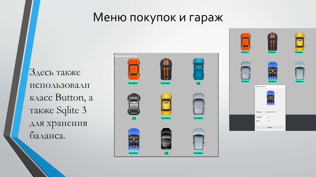 Меню покупок и гаражЗдесь также