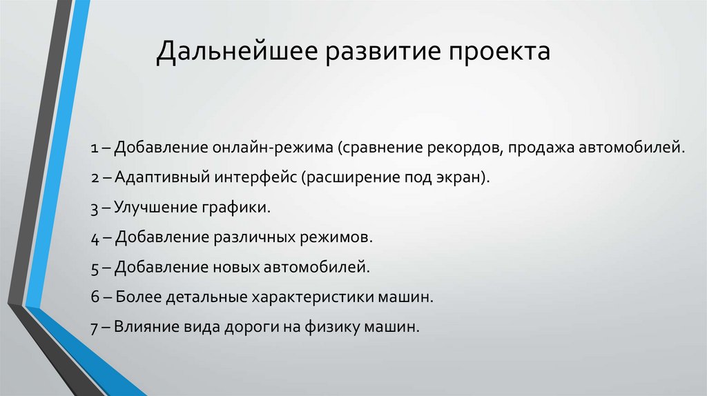 Дальнейшее развитие проекта1 – Добавление онлайн-режима (сравнение рекордов, продажа автомобилей.