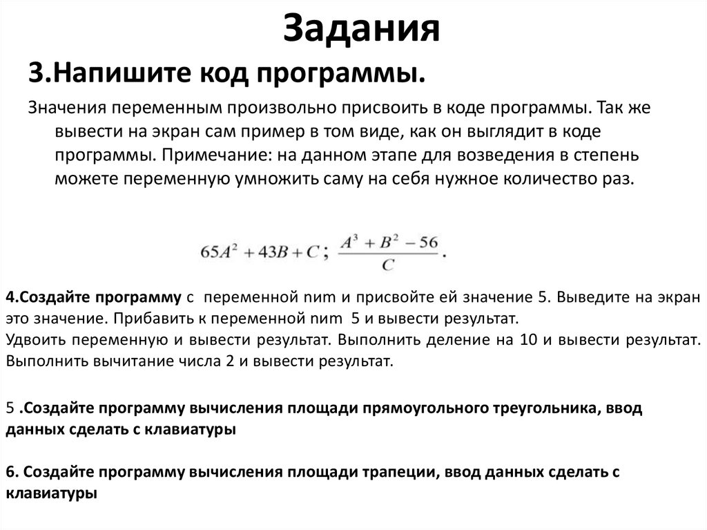 6. Создайте программу вычисления площади трапеции, ввод данных сделать с