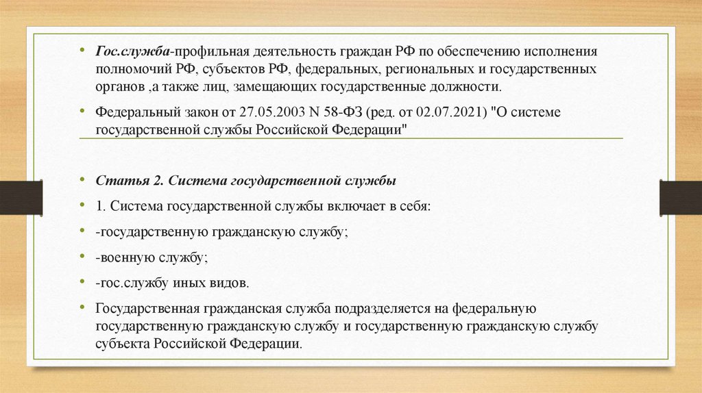 • Гос.служба-профильная деятельность граждан РФ по обеспечению исполненияполномочий РФ, субъектов РФ, федеральных, региональных и государственных