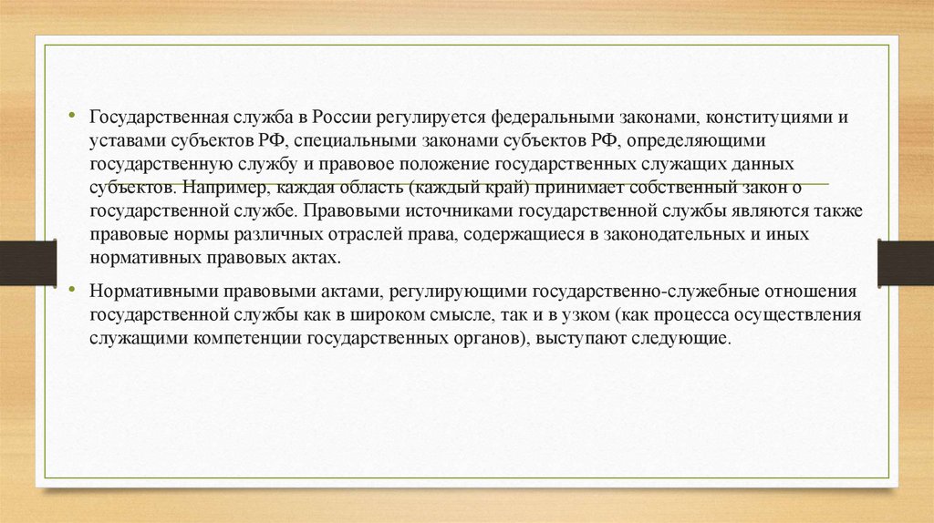 • Государственная служба в России регулируется федеральными законами, конституциями иуставами субъектов РФ, специальными законами субъектов РФ, определяющими