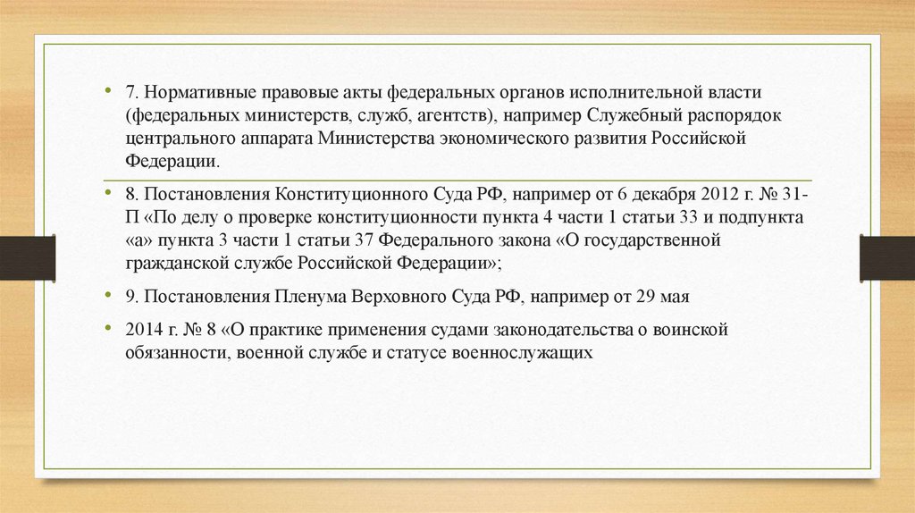 • 7. Нормативные правовые акты федеральных органов исполнительной власти(федеральных министерств, служб, агентств), например Служебный распорядок