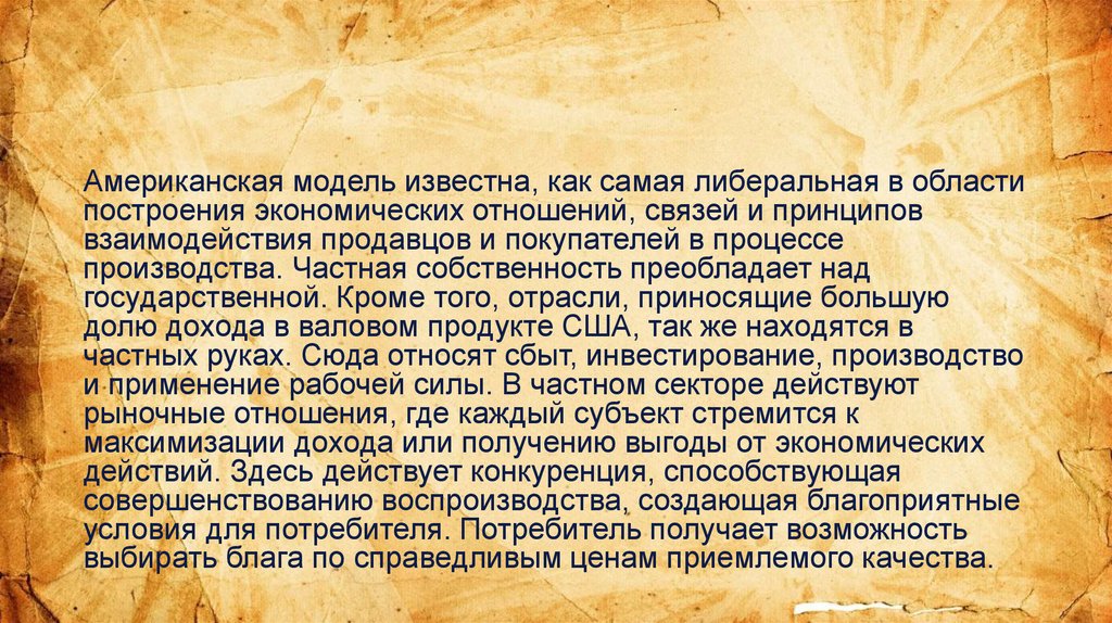 Американская модель известна, как самая либеральная в областипостроения экономических отношений, связей и принципов