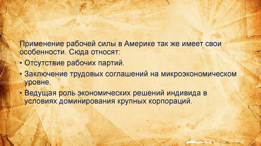 Применение рабочей силы в Америке так же имеет своиособенности. Сюда относят: